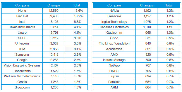 看下2013年Linux内核代码贡献排行榜,压根没有萎软: