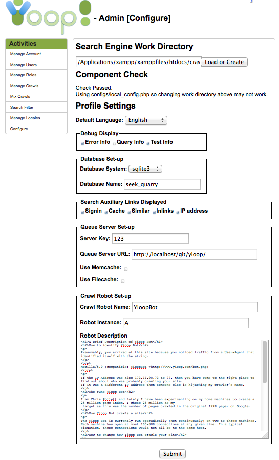 Yioop! 是一个 PHP 的搜索引擎,可用于 Web 的一般用途搜索,或者可提供URL搜索以及各种文档的索引搜索,包括:HTML, PDF, DOC, PPT, RTF, RSS, XML, SVG, PNG, JPG, BMP, GIF, 以及 sitemaps.