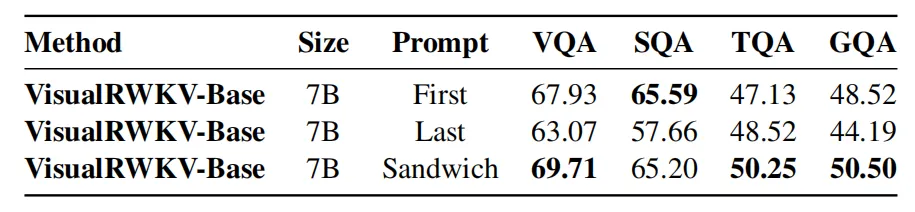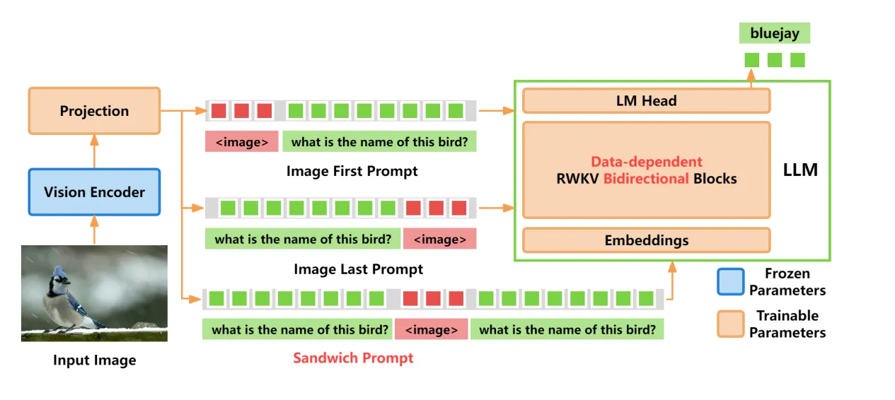 图 2 VisualRWKV 架构概述和三种提示词策略。图像在前提示:将图像标特征于文本向量之前;图像在后提示:将图像特征置于文本向量之后;三明治提示:将图像特征置于文本向量之间。红色文字表示主要贡献。