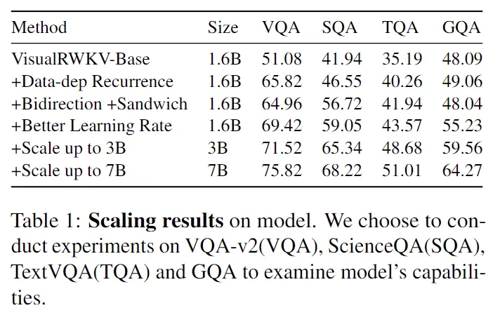 如下表所示,VisualRWKV 引入 Data-dependent Recurrence 后,在 VQA 测试集上效果上涨了接近 15 个点,非常让人印象深刻。