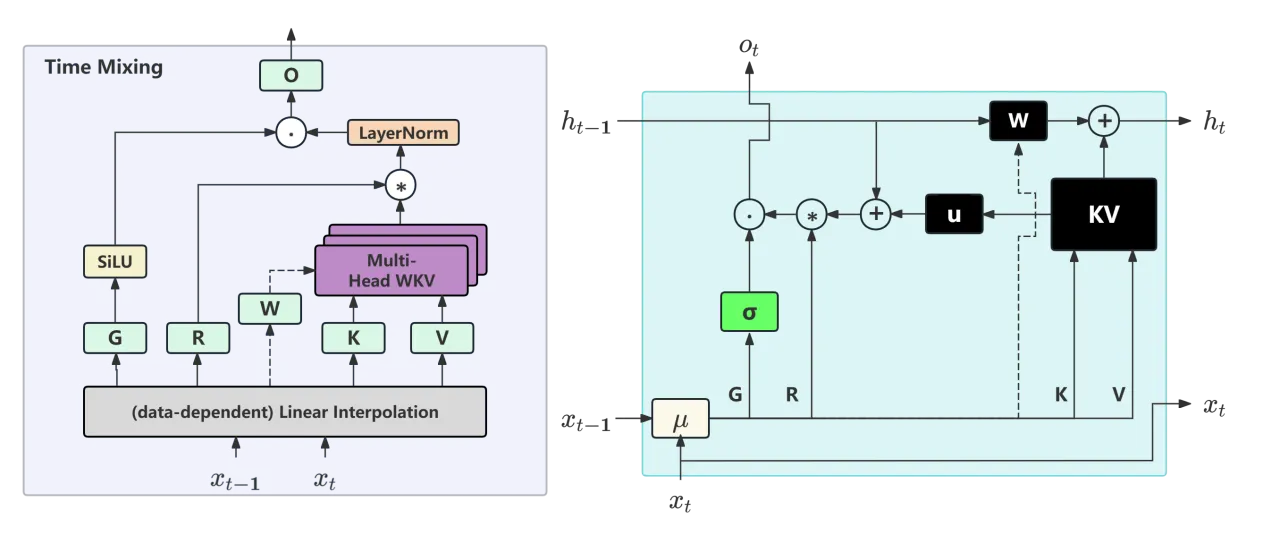 - 数据依赖的时间混合:将时间衰减向量从固定参数变为动态,使模型能更灵活适应输入数据,提升性能