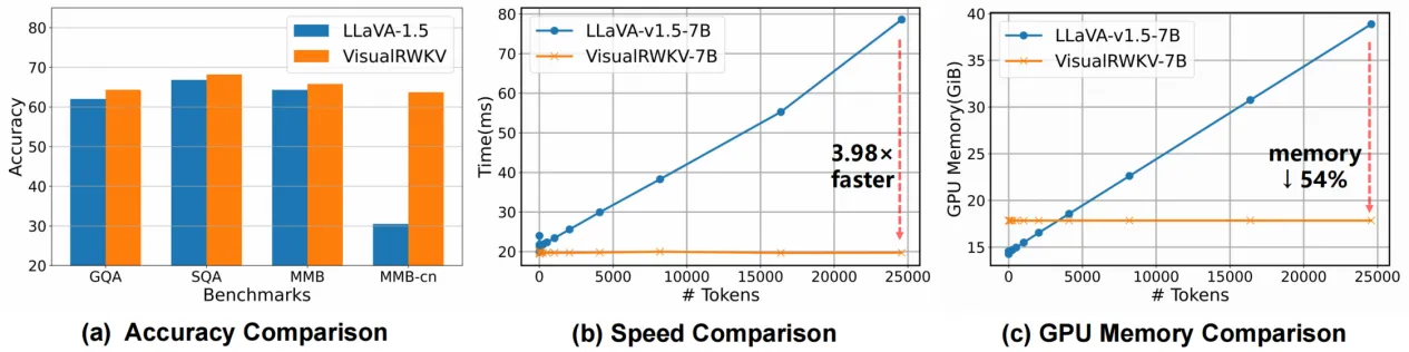 我们提出了数据依赖的递归和三明治提示词来增强我们的建模能力,以及一个 2D 图像扫描机制来丰富视觉序列的处理。广泛的实验表明,VisualRWKV 在各种基准测试上达到了与基于 Transformer 的模型如 LLaVA-1.5 相竞争的性能,如图 1所示。同时,当上下文长度达到 24K 时,推理速度比 LLaVA-1.5 快3.98 倍,GPU 显存占用少 54%。