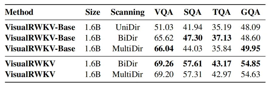 我们比较了三种图像扫描机制:单向扫描(UniDir)、双向扫描(BiDir)和多向扫描(MultiDir)。如表 4所示,UniDir 的表现最差,因为它天生不适合处理 2D 视觉信息。BiDir 和MultiDir 在各种基准测试评估中显示出相似的结果,但 BiDir 在大多数情况下表现更好,突显了它在处理多模态学习任务中的 2D 视觉信息方面的优势。