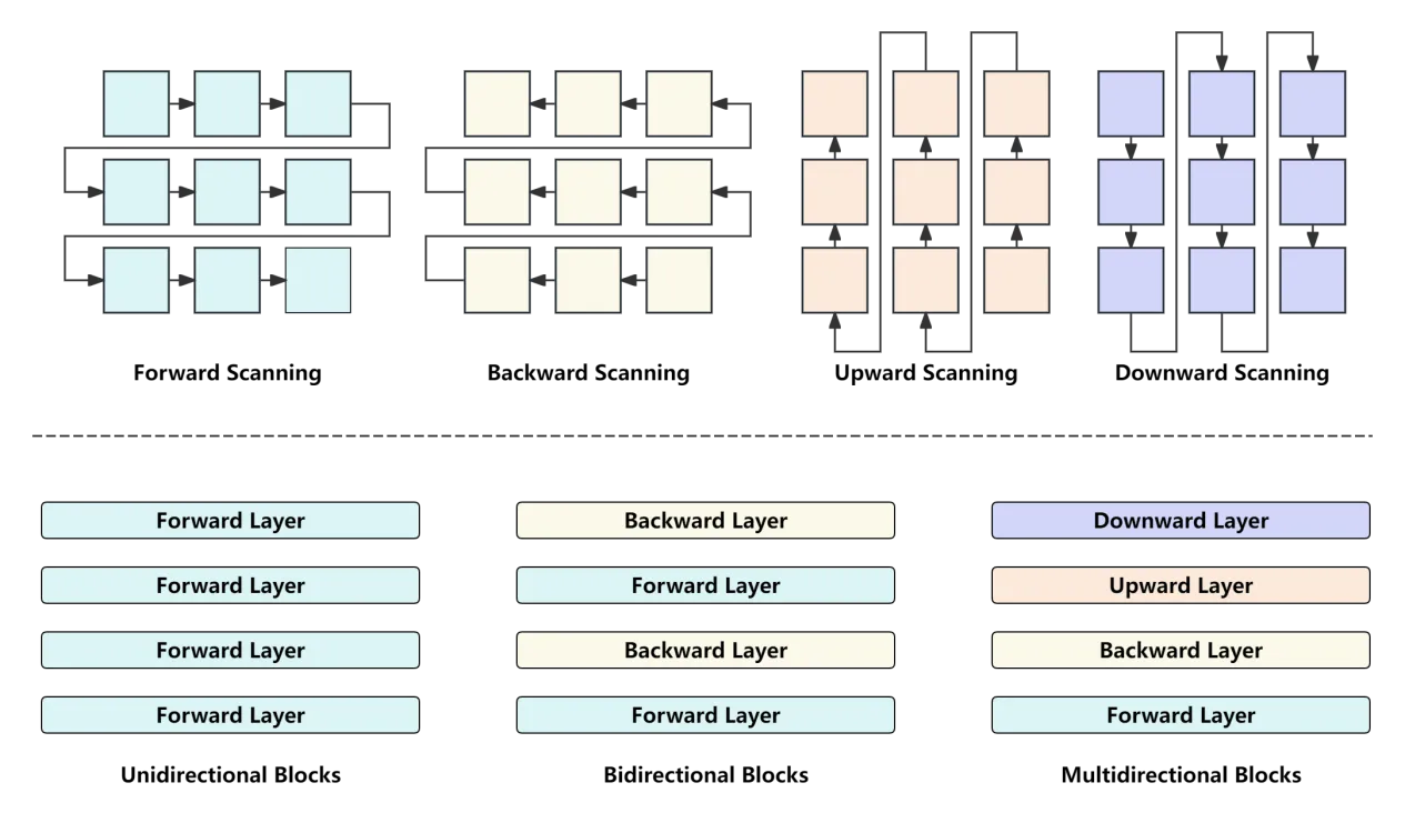 图 4 展示了 3种不同的多模态 RWKV 块:单向块(左),双向块(中),以及多向块(右)。顶部还描绘了四种扫描模式。