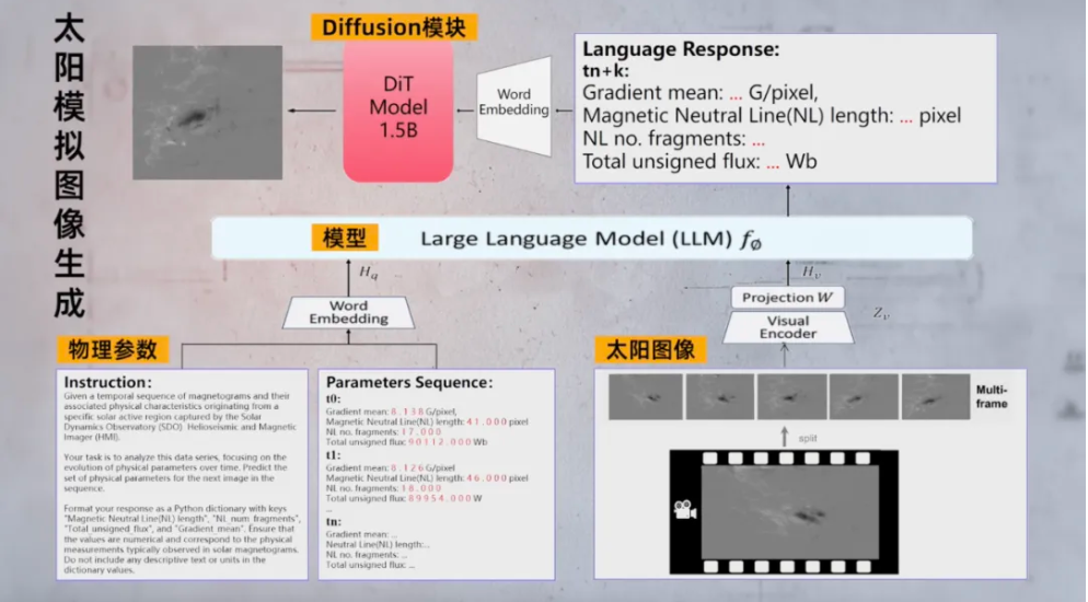 根据介绍,基于Qwen-VL等模型,“金乌”太阳大模型以超过90万张太阳卫星图像为样本完成微调训练。通过输入上一时段的太阳物理参数及对应的观测图像,“金乌”可预测未来24h的耀斑爆发情况。同时,“金乌”可推测出下一时段的物理参数,通过调用扩散模型生成下一时段的太阳模拟图像。