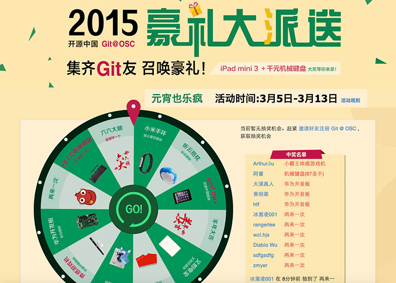 当我第一次知道OSC弄元宵抽奖的时候,其实我是,是拒绝参加的,因为我觉得抽奖这件事,你不能说叫我说抽就抽,首先我要看一下,看一下奖品有没有 我想要东西,如果我分享出去基友们看到我发的活动奖品很寒酸、很low、很cheap、没有吸引力,基友出来一定骂我,说我没有追求太屌丝,以高帅自称的 我以后该如何在基友圈中立足。后来,我知道他们的奖品很壕很酷炫很高端,ipad mini若能抽到一部当然是极好的~哎哟之前抽的都是cherry键盘这次竟然换成了圣手二代,想必手感一定是极佳的~颈椎治疗仪这种码农必备健康仪器也 是吸引力十足啊~童年回忆小霸王!!还有赞助的各种礼品!真是太棒辣!分享出去的话我在基友心中的逼格一定又duang的一下变高了!我要当拿走这些奖品 的人!我要抽奖特技特技加特技、duangduang duangduang duang勒个duang。我现在呢,每天还是加特技,加了很多特技,邀请好多Git友来玩git@osc,DUANG~~DUANG~~DUANG~~ 我的机会蹭蹭蹭的增加,奖品蹭蹭蹭的来,肥皂蹭蹭蹭的买,因为我,加特技……