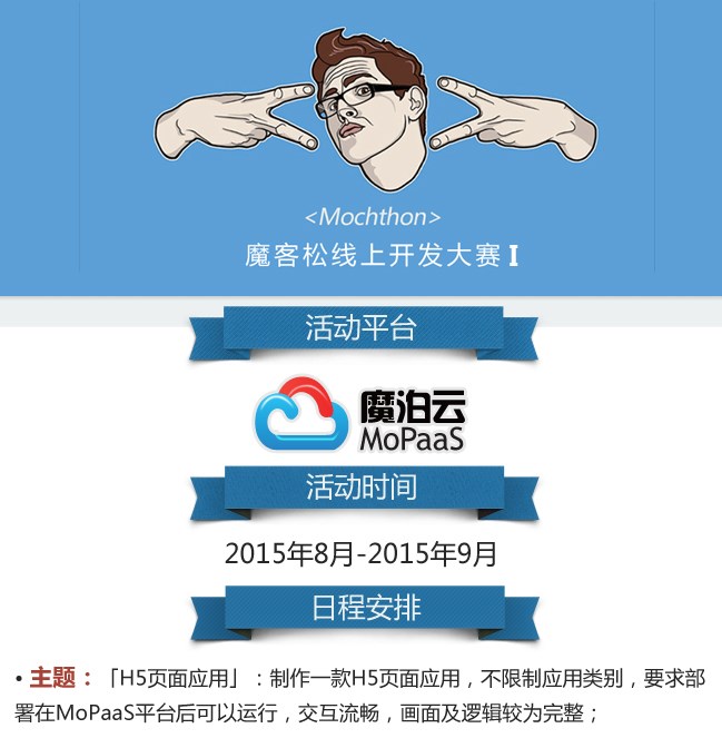 由MoPaaS主办的魔客松开放报名一周以来,参与人数不断增加,有了媒体合作方:Segment Fault的加盟,为了让更多开发者及用户参与其中,报名截止日期将延长一周,即此次活我们的报名截止日期为8月21日,同时此次活动的奖品的吸引度有了大幅度的提升,还不赶紧参与!