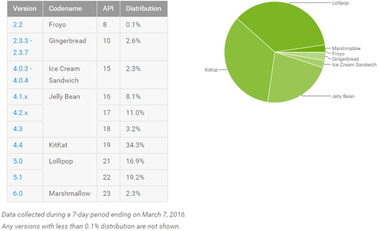要 指出的是,上述数据采集自需要采用Android 2.2或更高系统版本的谷歌应用商店Google Play Store应用。这意味着搭载更旧版本的设备以及没安装Google Play的设备(包括中国的众多手机和平板电脑、亚马逊Fire系列设备等等)不在数据统计范围内。另外,使用份额不到0.1%的Android版本在谷 歌的报告中并没有列举出来,如Android 3.0“蜂巢”。