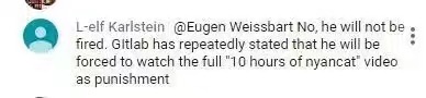 为此 Gitlab 称其已经不断的声明不会炒掉这名运维人员,但是会罚他看一个名为 "10 hours of nyancat" 的视频。我去搜了一下这个视频 https://www.youtube.com/watch?v=jIQ6UV2onyI (请自行准备梯子),的确的确的确超级无聊,而且还有纯浏览器版本 http://www.nyan.cat/ ,士可杀不可辱啊,哈哈。
