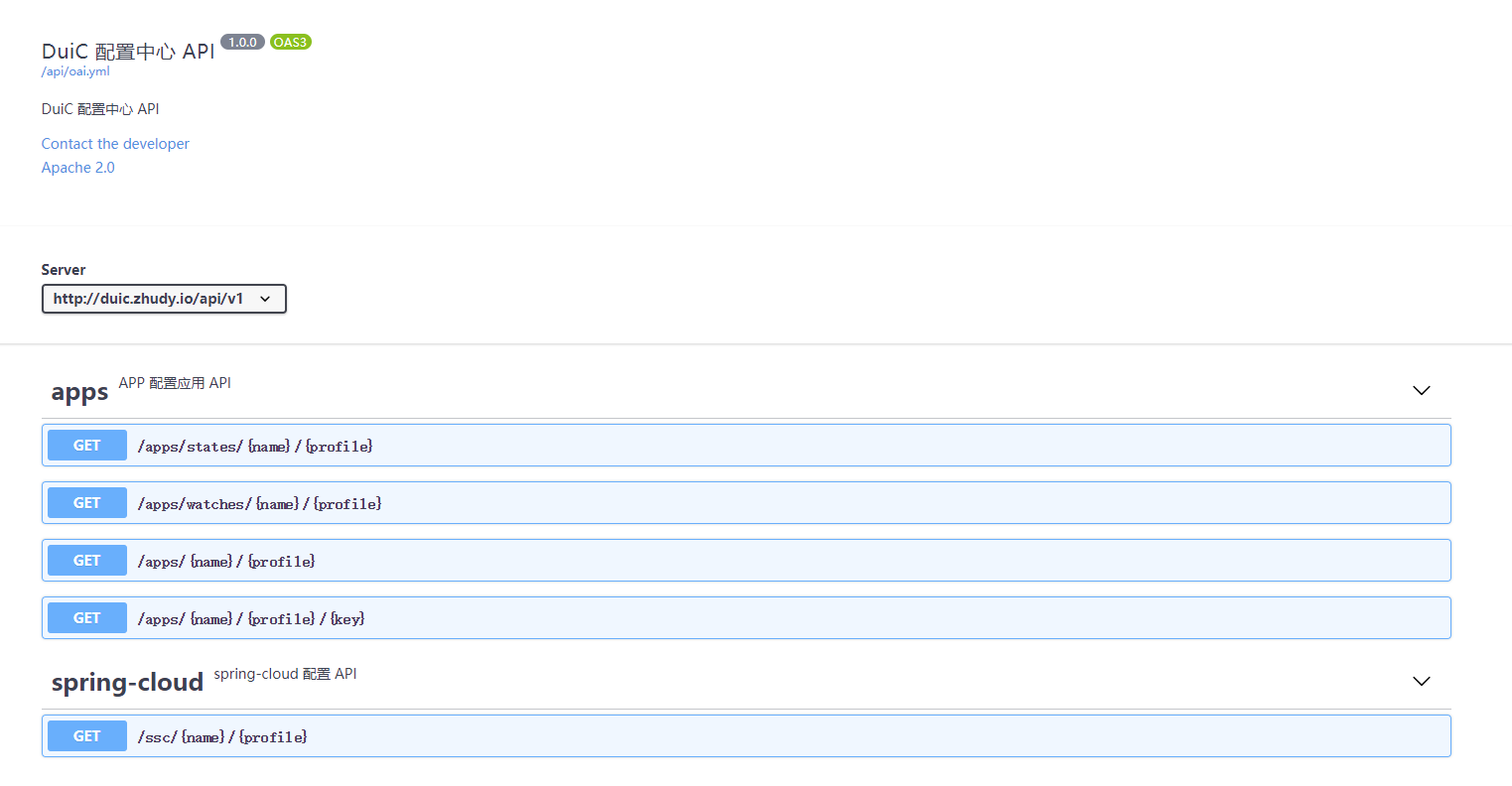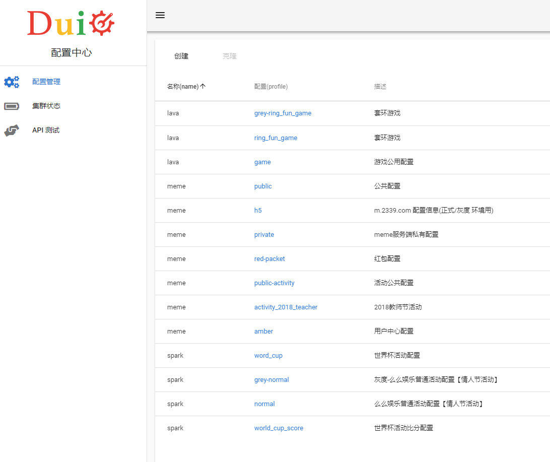 在 web 控制台中你可以创建多个配置,相同应用不同环境的配置可以使用(profile)区分,同一个应用下多个(profile)配置可以合并 https://duic.zhudy.io/index.html
