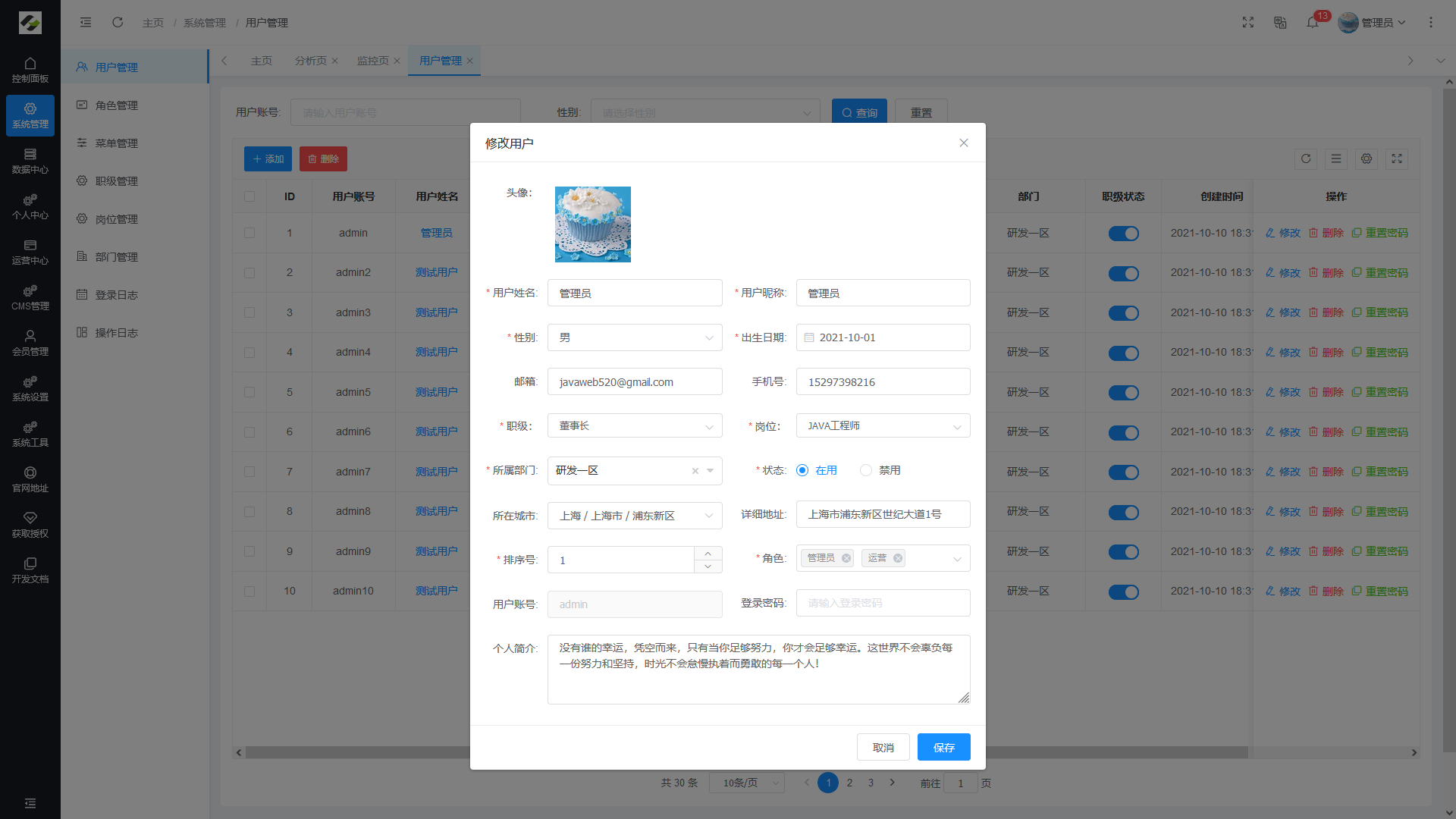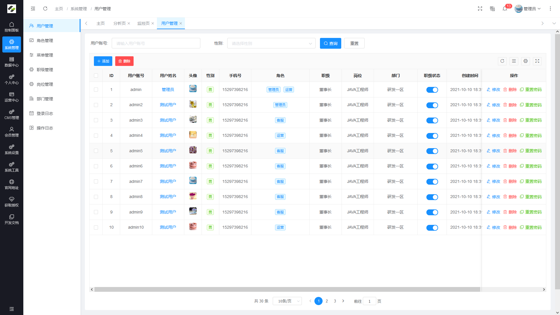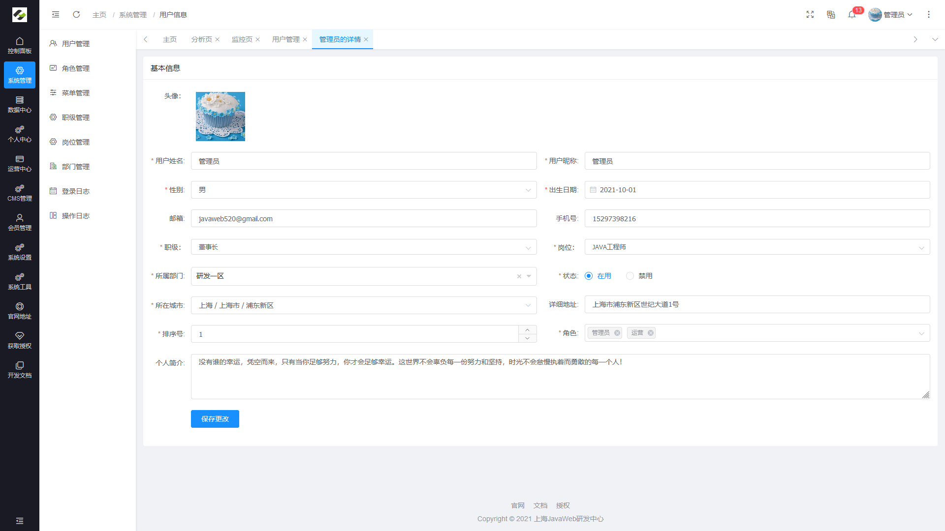 - 用户管理:用于维护管理系统的用户,常规信息的维护与账号设置。
