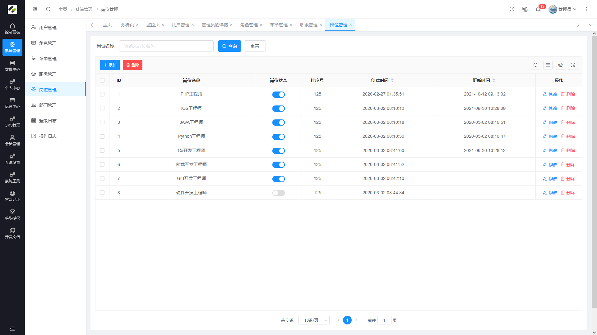 - 岗位管理:主要管理用户担任的岗位。