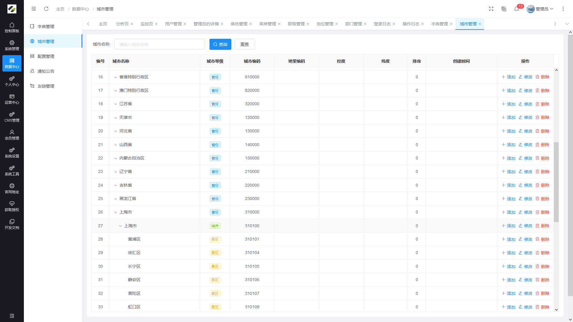- 城市管理:统一对全国行政区划进行维护,对其他模块提供行政区划数据支撑。