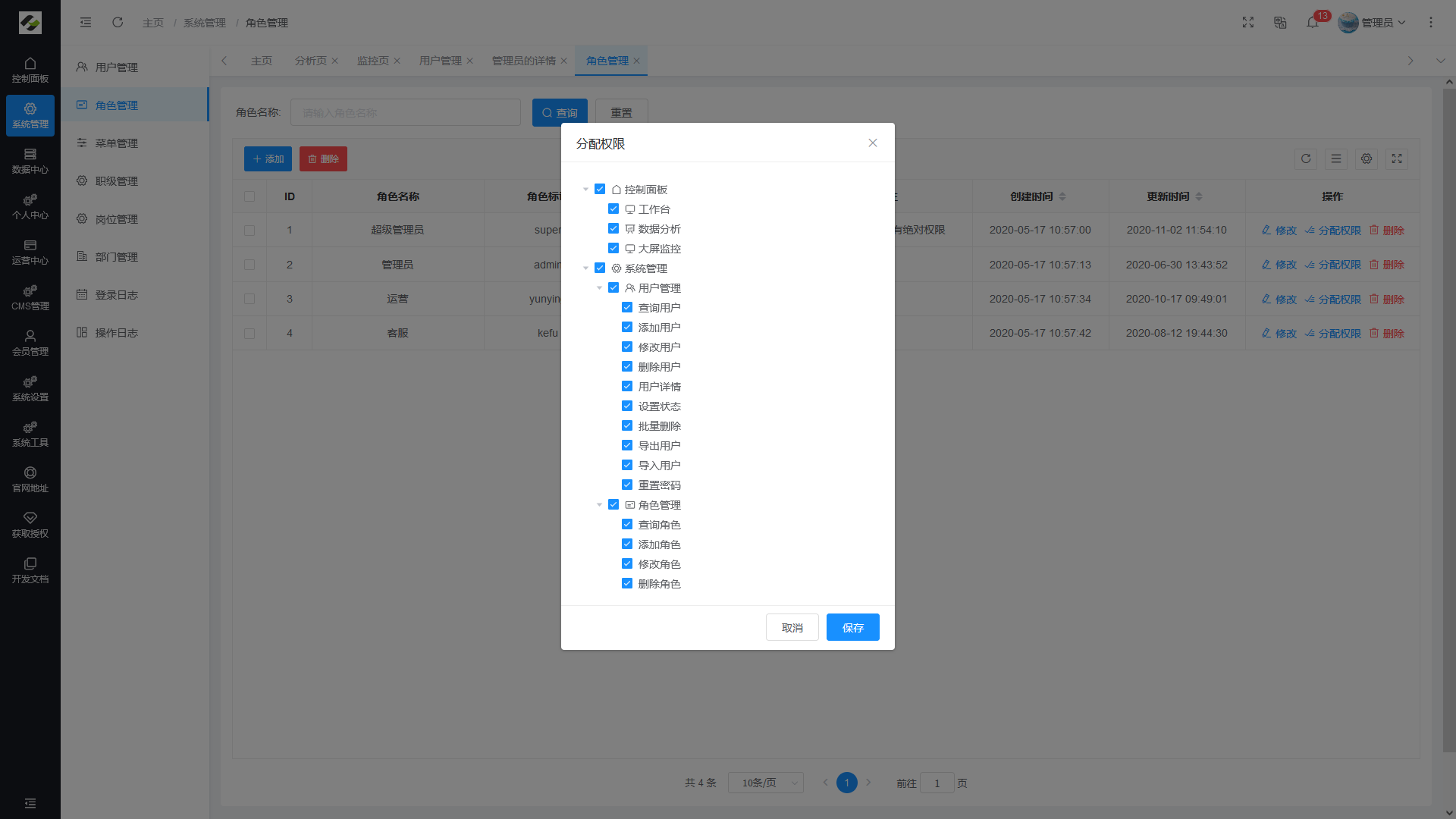 - 角色管理:角色菜单管理与权限分配、设置角色所拥有的菜单权限。