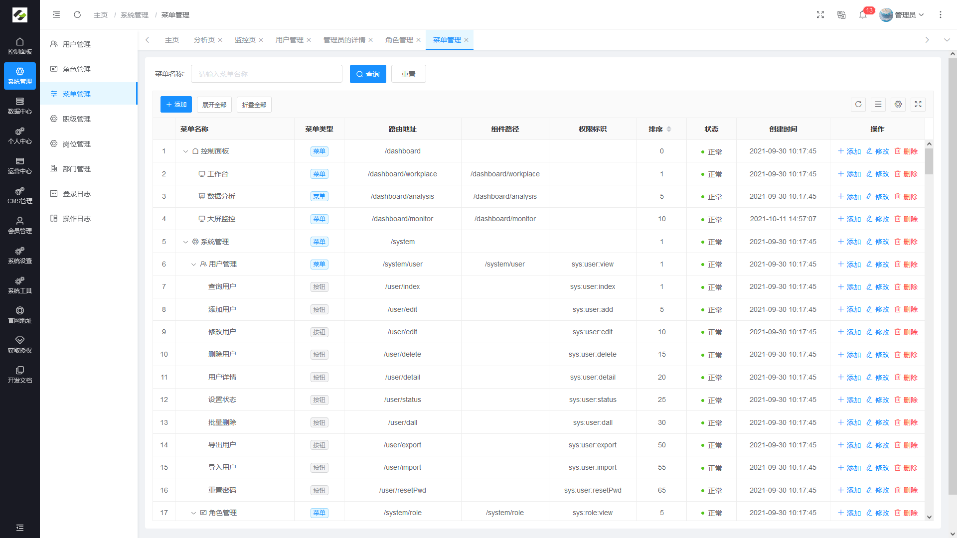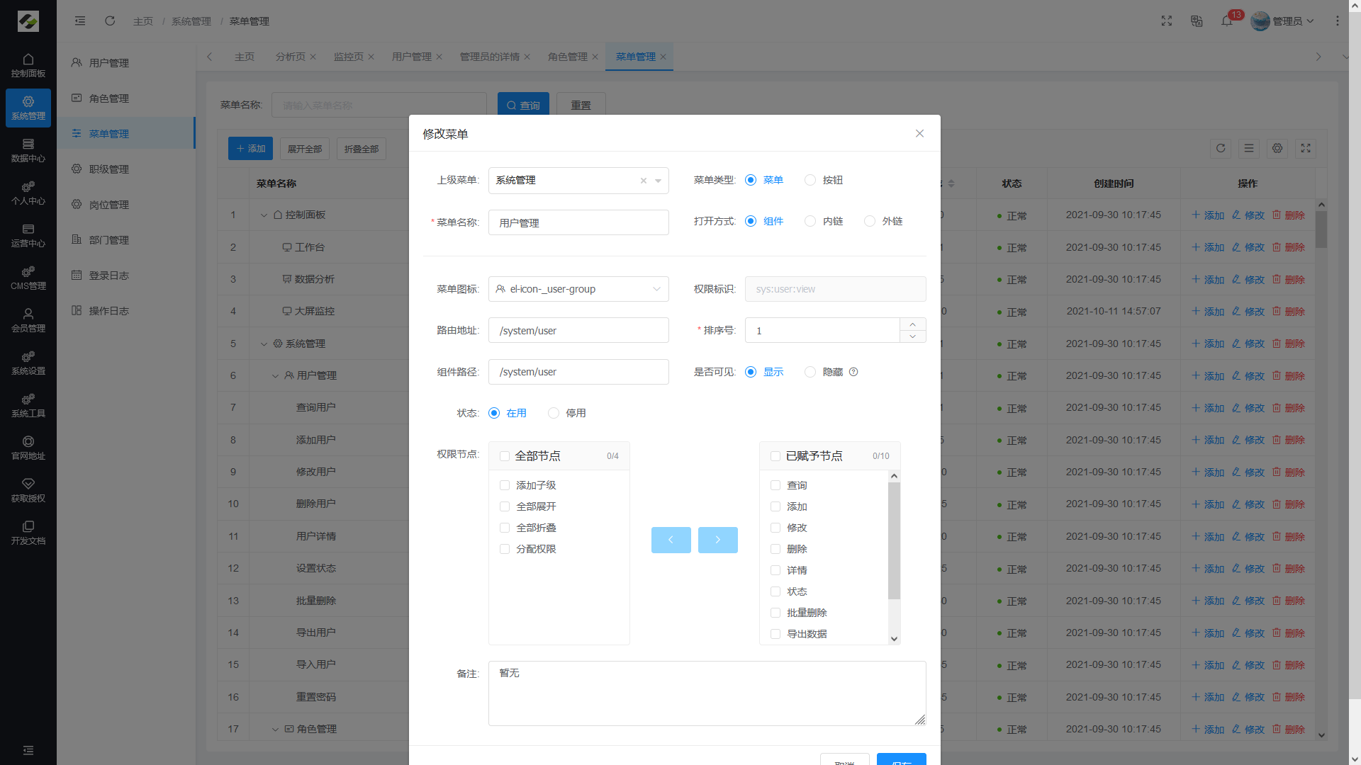 - 菜单管理:配置系统菜单,操作权限,按钮权限标识等。