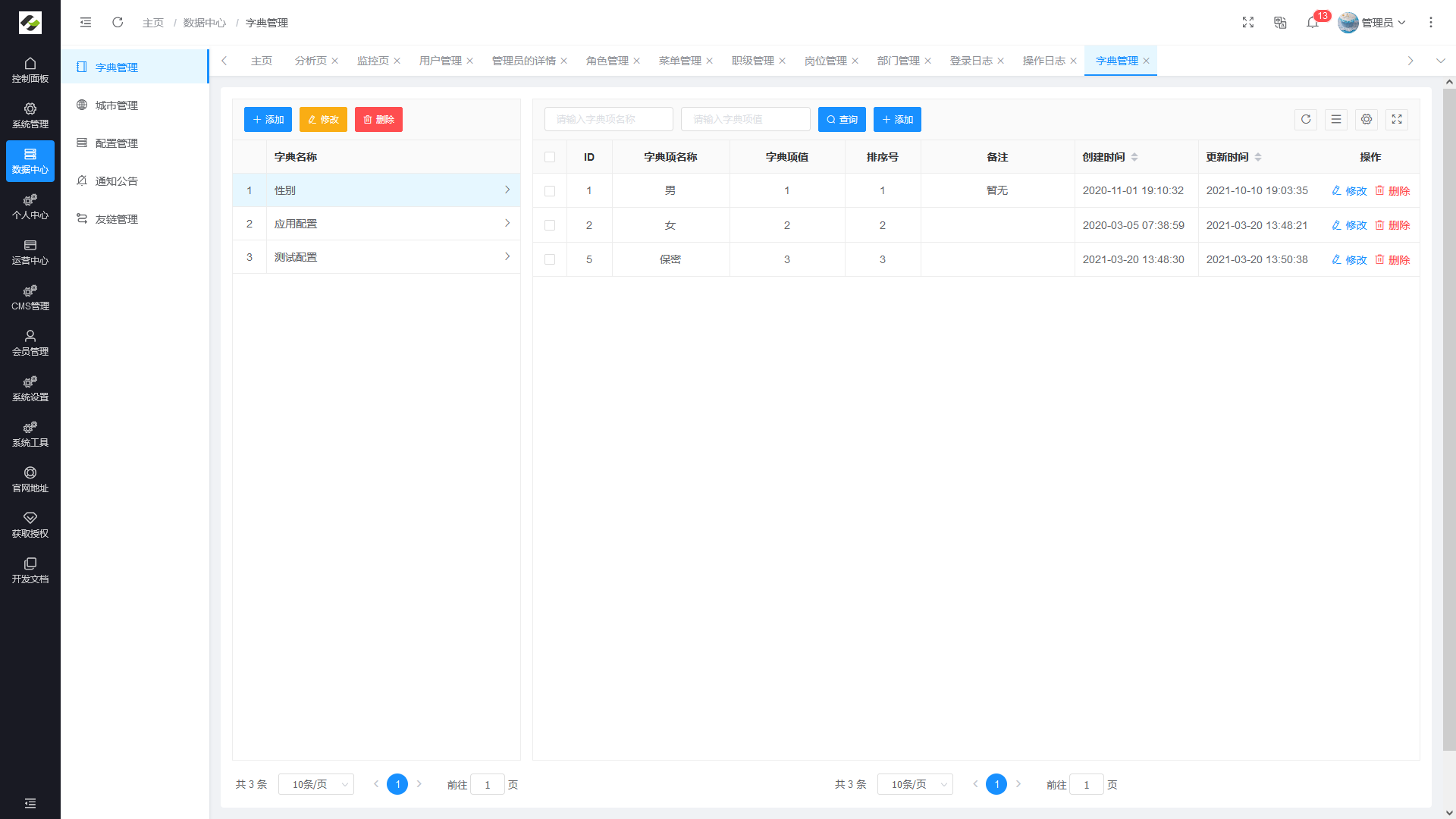 - 字典管理:对系统中常用的较为固定的数据进行统一维护。