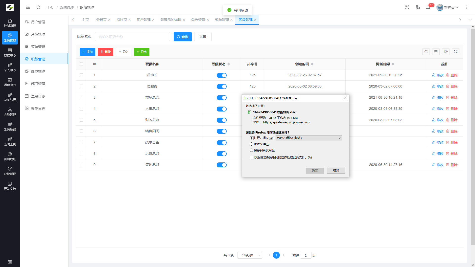 - 职级管理:主要管理用户担任的职级。