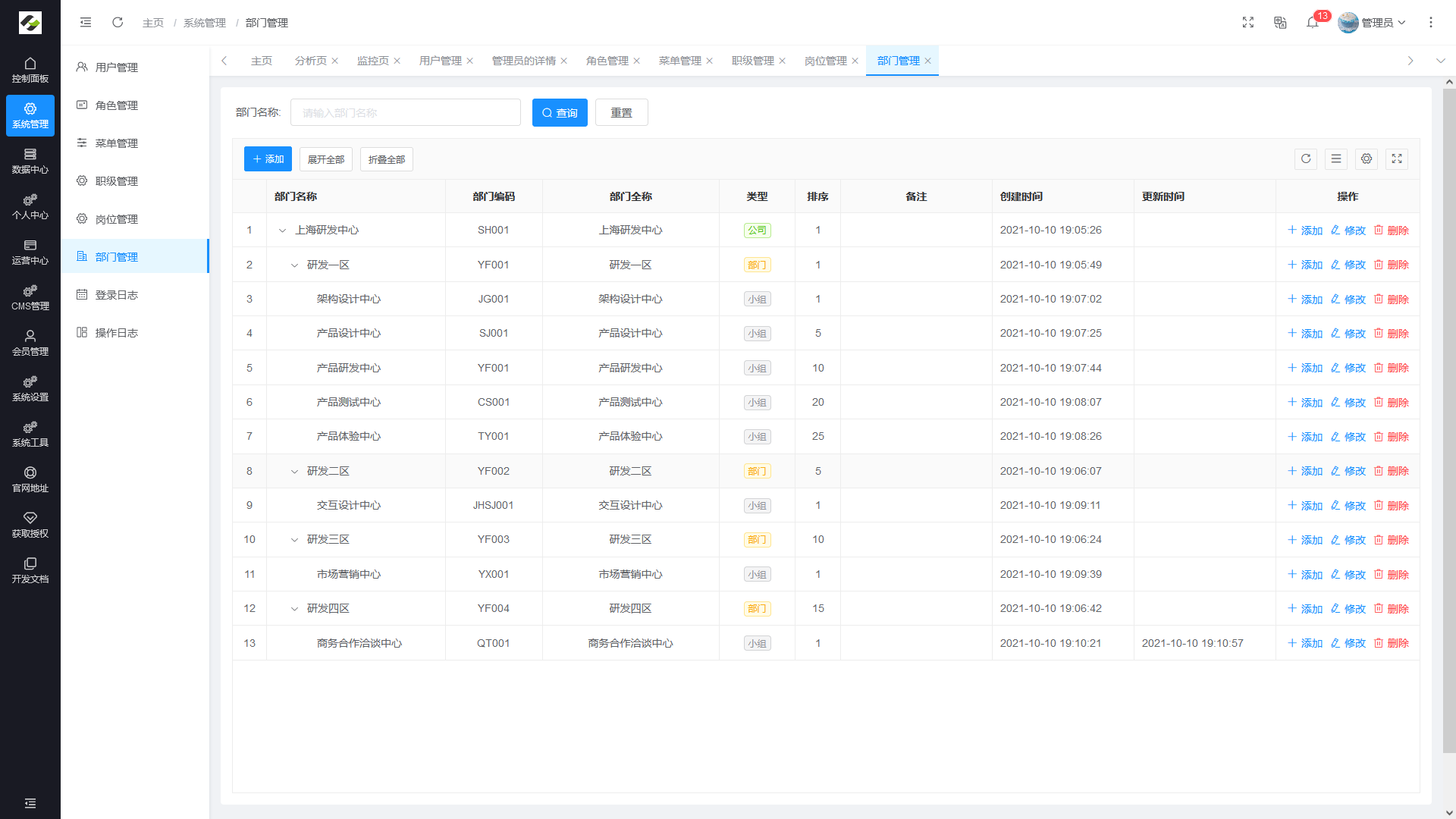 - 部门管理:主要管理系统组织架构,对组织架构进行统一管理维护。