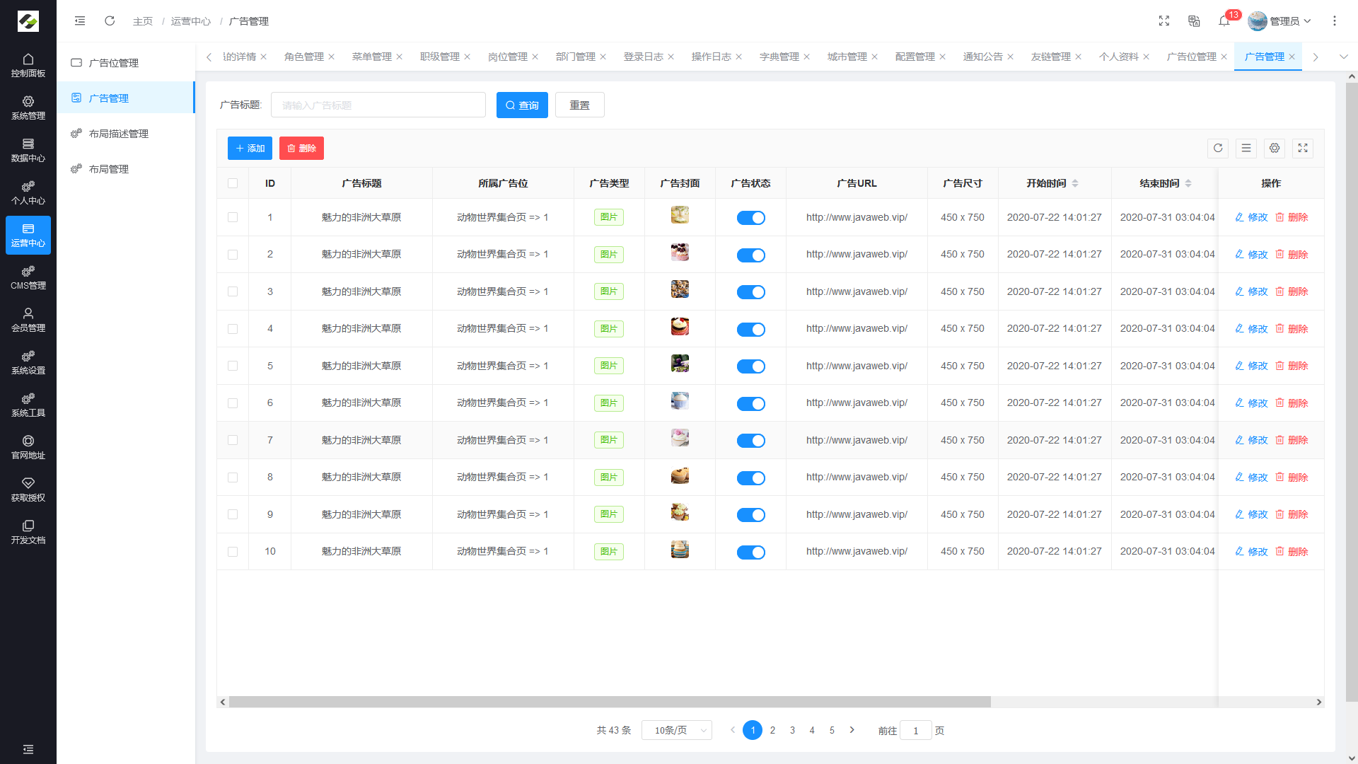 - 广告管理:主要对各终端的广告数据进行管理维护。