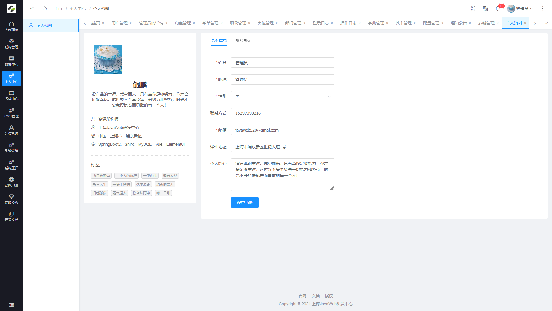 - 个人中心:主要是对当前登录用户的个人信息进行便捷修改的功能。