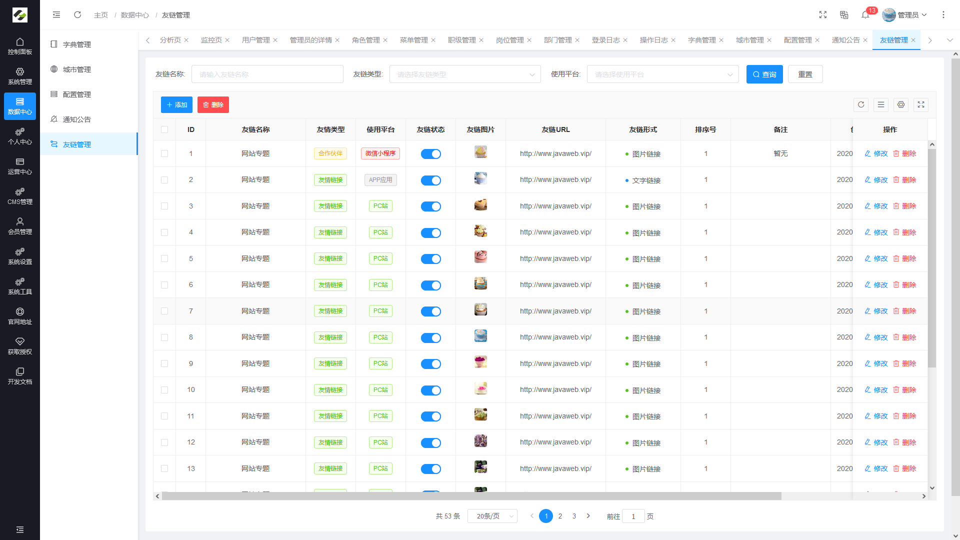 - 友链管理:对系统友情链接、合作伙伴等相关外链进行集成维护管理的模块。
