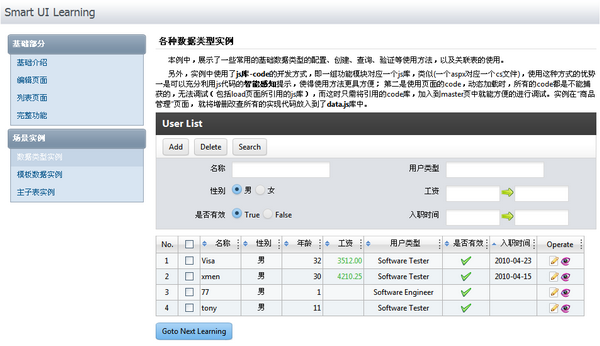 JQuery Smart UI是基于JQuery的Ajax开发框架,实现前、后台分离、功能和数据分离,UI层全部使用htm+js+json完成,通过一个统一数据接口与服务端进行数据交换。