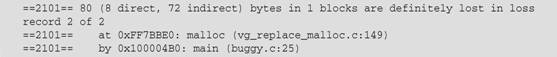 你应该养成习惯在可能的情况下使用诸如 Valgrind这样的工具来对发现和修复内存泄漏以及其他编程错误的过程进行自动化。因为这里只对Valgrind进行了肤浅的介绍,所以你需要查看它 的在线文档以更全面的了解其功能。事实上,越来越多的开放源码项目都依赖于Valgrind作为其回归测试(任何一个具有相当规模的软件项目的一个重要组 成部分)的一部分。